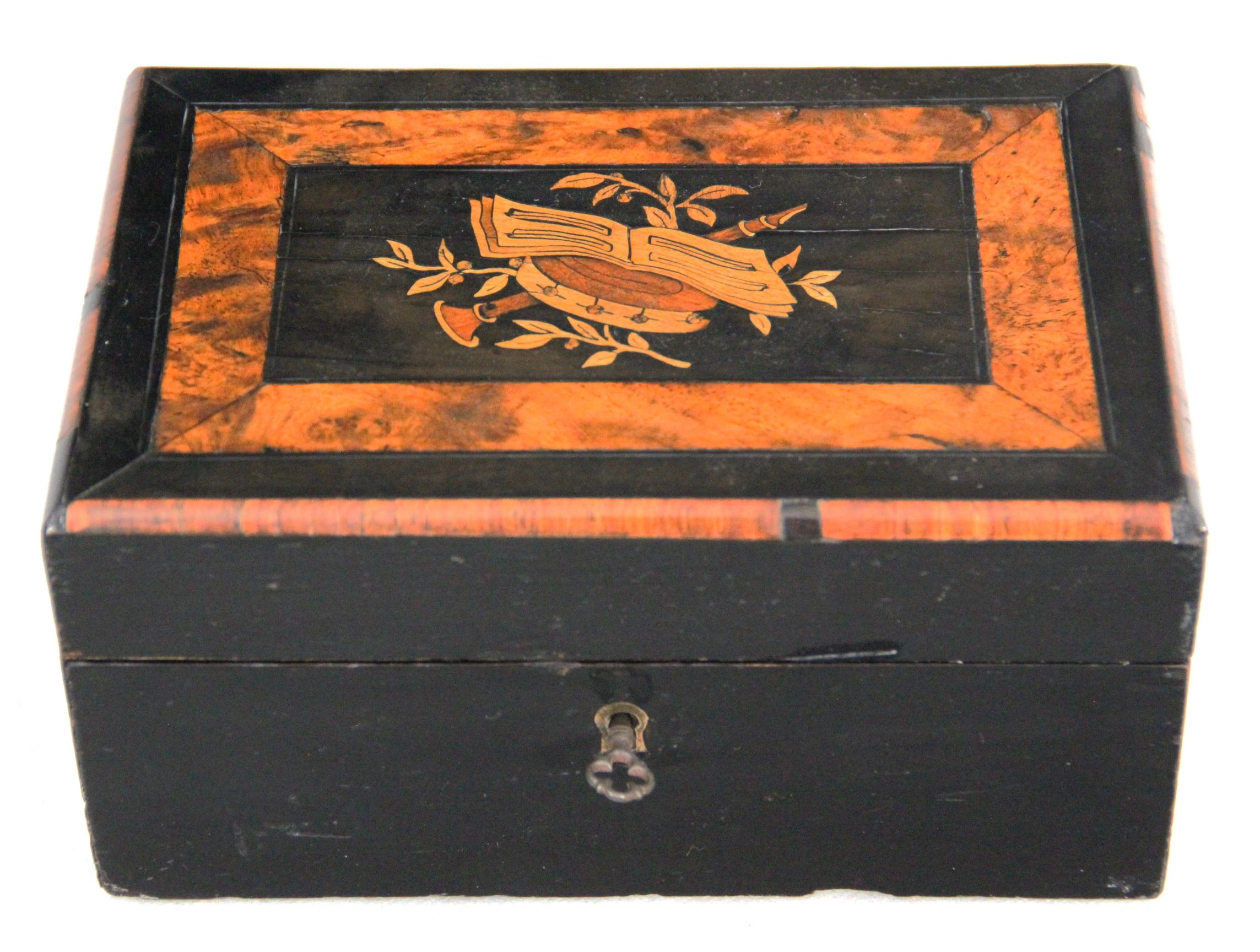 Midvictoriaans kistje met crosbanding en inleg op deksel. Gezwart hout.