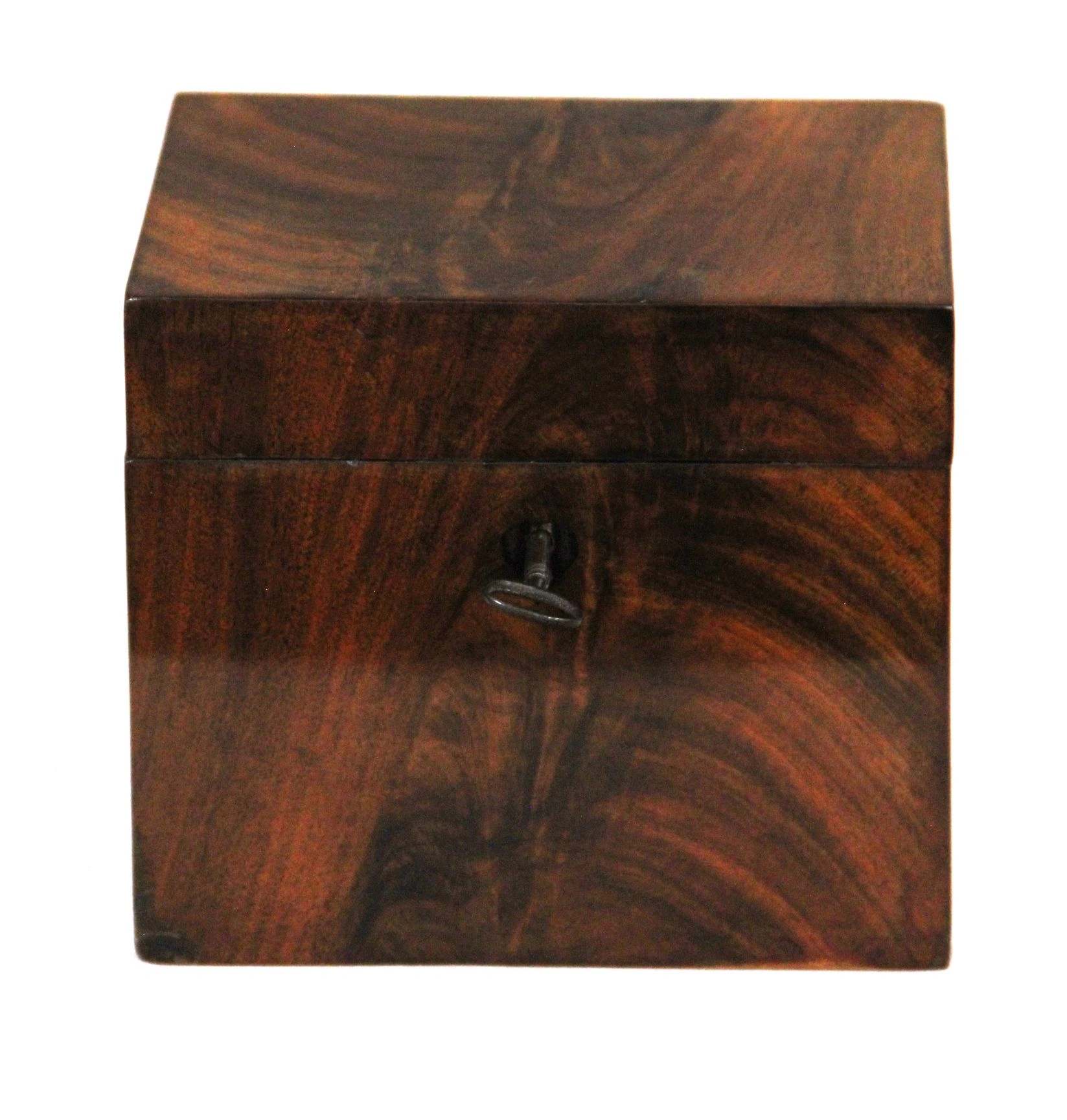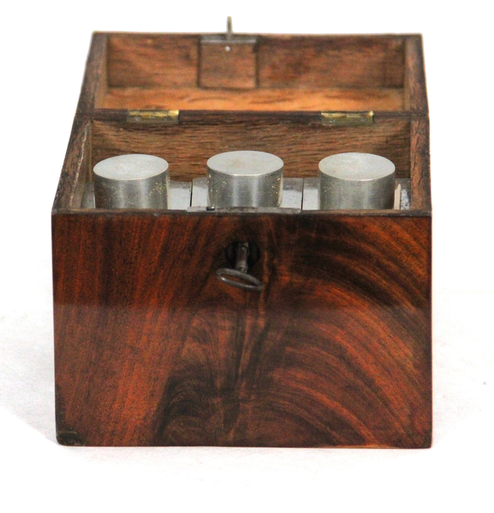 Mahoniehouten kistje met 3 tinnen drankflesjes.