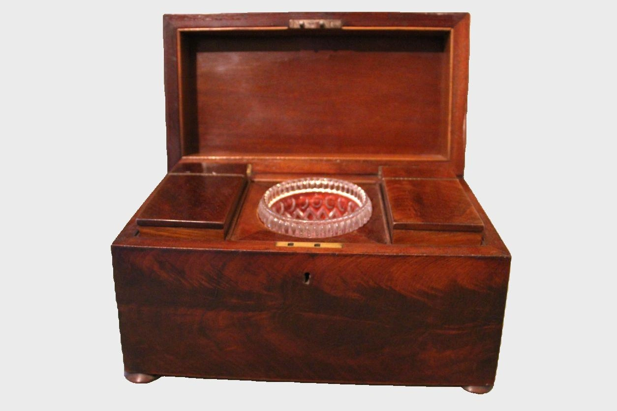 Mahoniehouten theacaddy met twee theedoosjes en het originele mengglas binnenin.