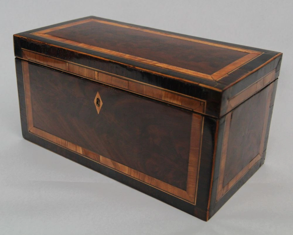 Rechthoekige theedoos gefineerd met Cubaans mahonie en dubbele crossbanding met palissanderhout en satijnhout. Binnenin met twee compartimenten en centraal het mengglas.