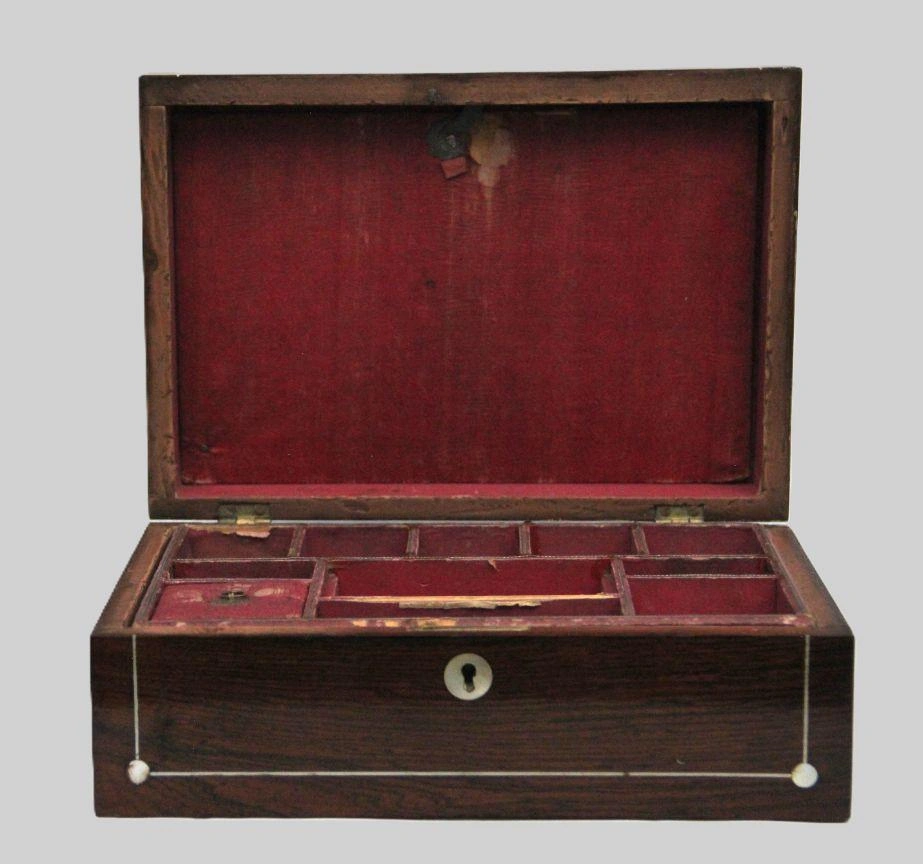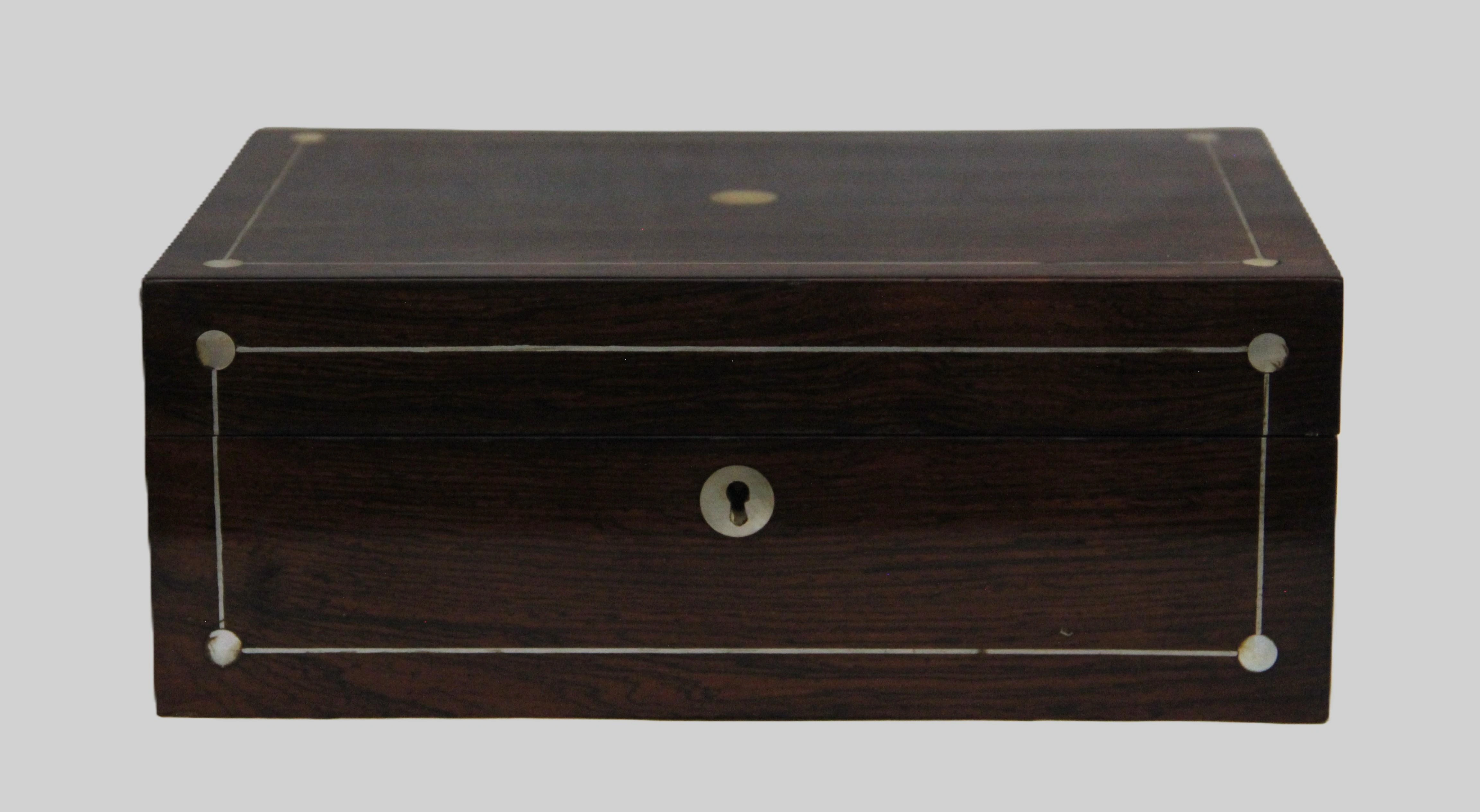 Naaidoos met oorspronkelijke binnenverdeling in twee lagen. Palissander hout met zilver filet en parelmoer ingelegd op deksel en voorkant.