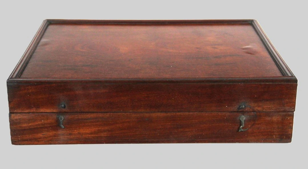 Een speldoos in mahoniehout, ingericht voor tric-trac met bijhorende schijven en dobbelstenen.