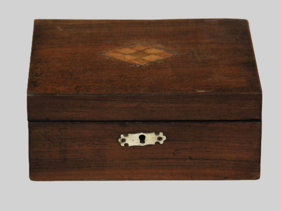 Mahonie doosje met inlegwerk in diverse houtsoorten.