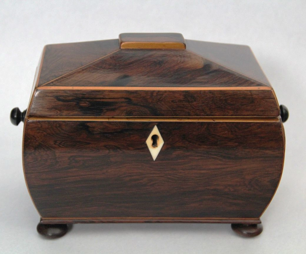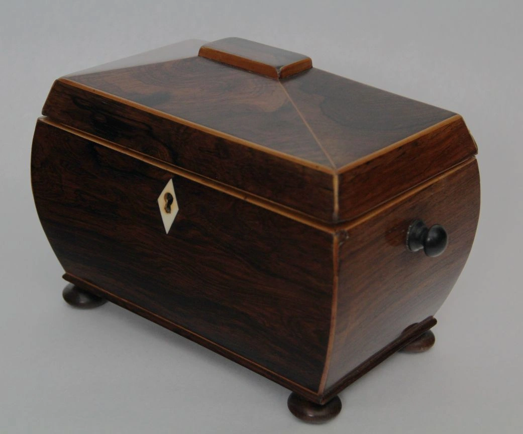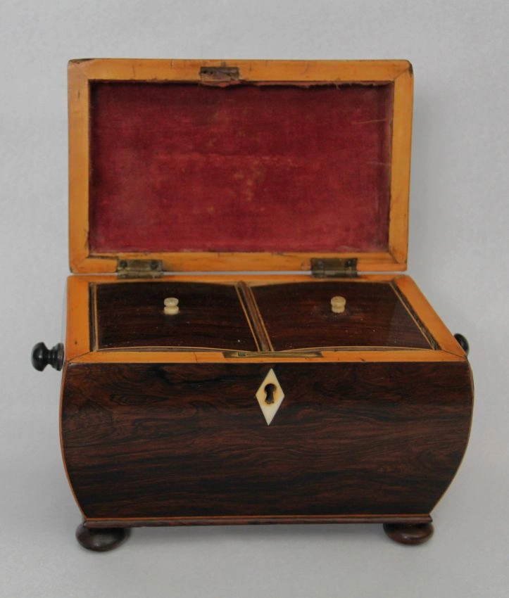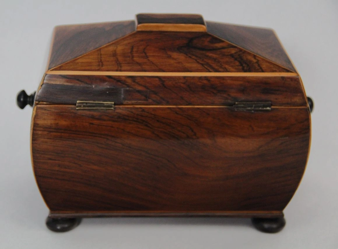 Sarcofaagvormig theedoosje in palissanderhout en afboordingen in satijnhout. Binnenin voorzien van twee compartimenten, elk afgedekt met een dekseltje in palissanderhout en een knopje in ivoor.