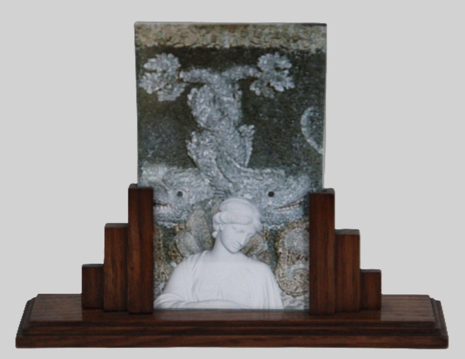 Fotolijst met houten onderstel in eik en inschuifbare dubbele glasplaat als fotohouder.