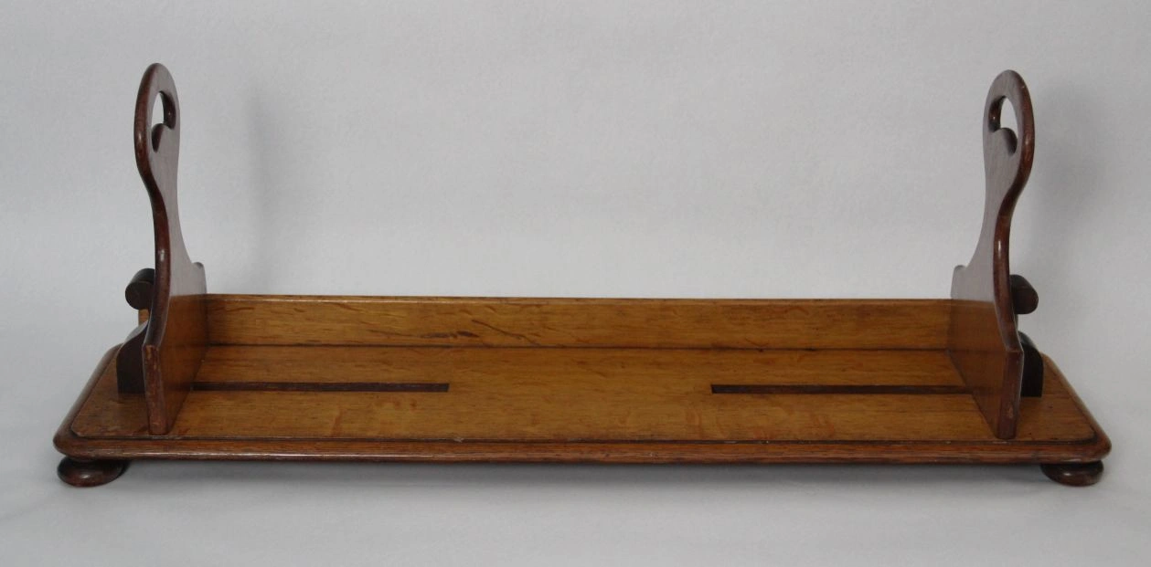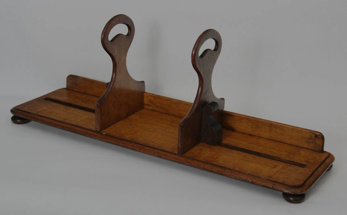 Draagbare boekenstand die oorspronkelijk gebruikt werd in leeszalen van bibliotheken. Met deze boekenstand kon men een serie boeken ophalen en naar de leestafel dragen. De twee steunen zijn verschuifbaar om de boeken samen te houden. De steunrand achteraan belet dat de boeken uit de drager schuiven.