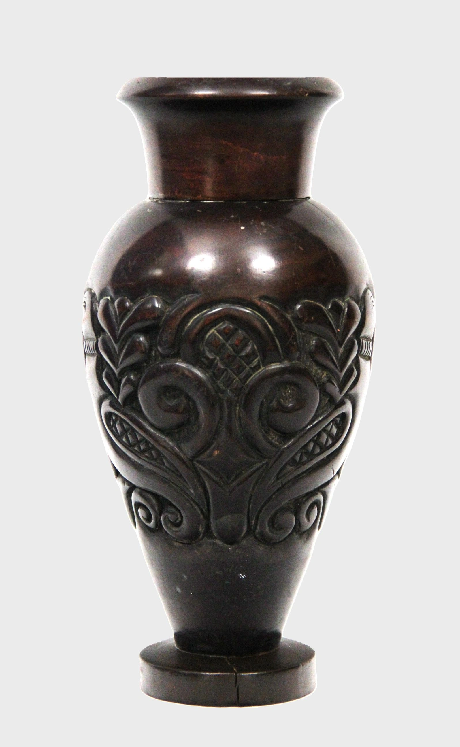Eén van een paar houten vazen, donker mahonie gekleurd.