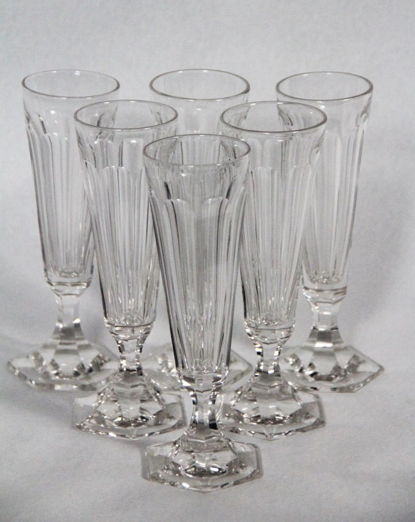 Set van 6 kristal champagneflutes op zeshoekige voet.