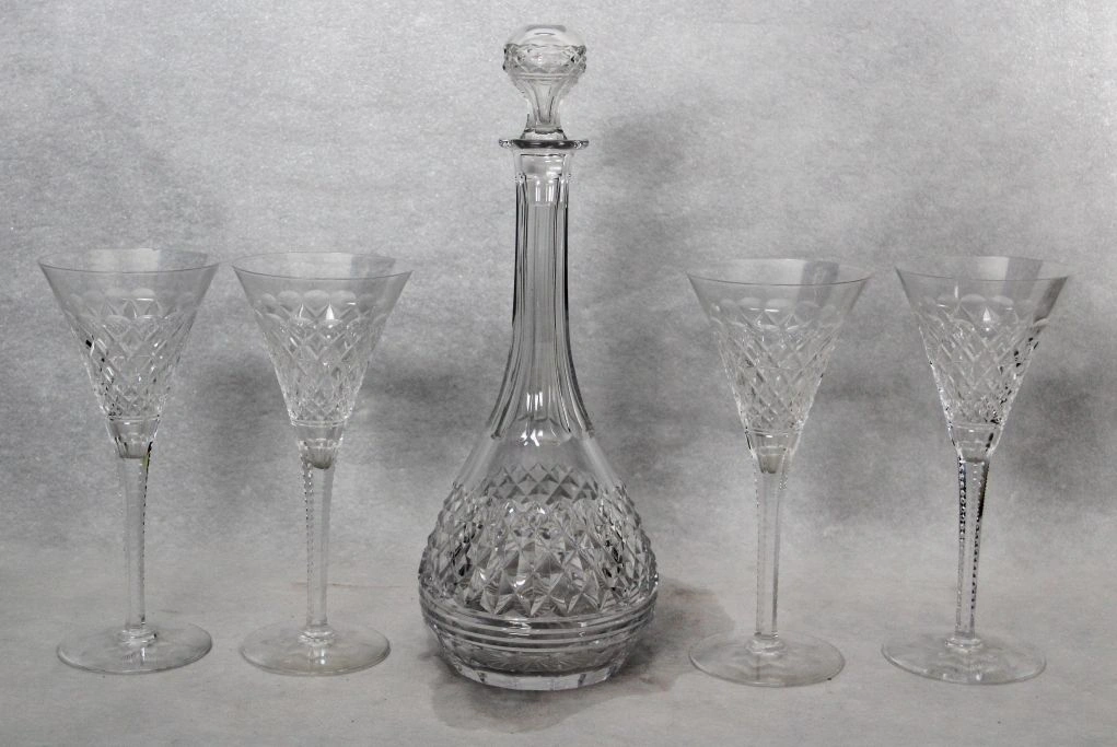 Vier bijhorende glazen in diamant geslepen kristal. Eén glas met klein schilfertje
