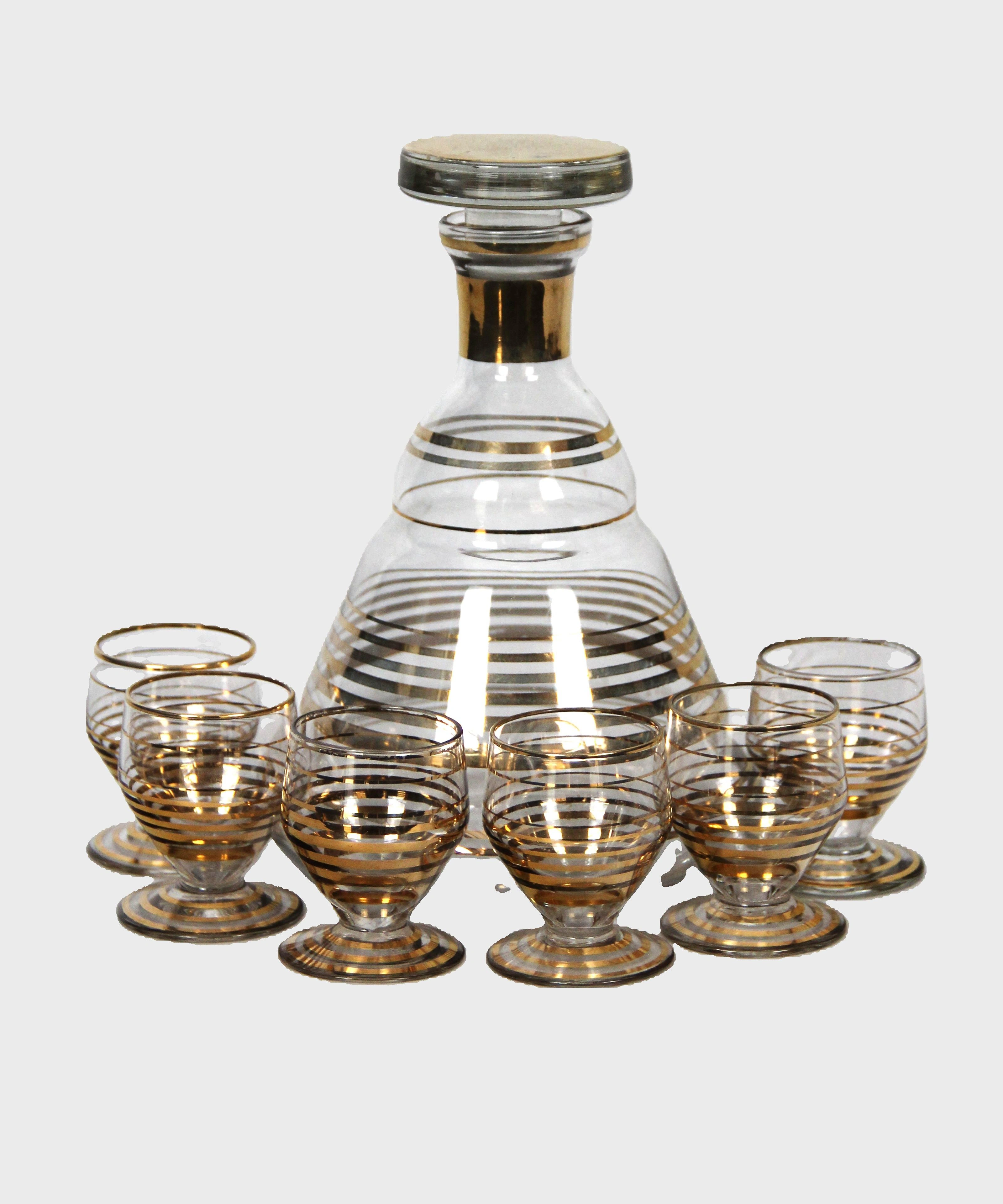 Likeurkaraf met 6 bijhorende likeurglaasjes in glas.