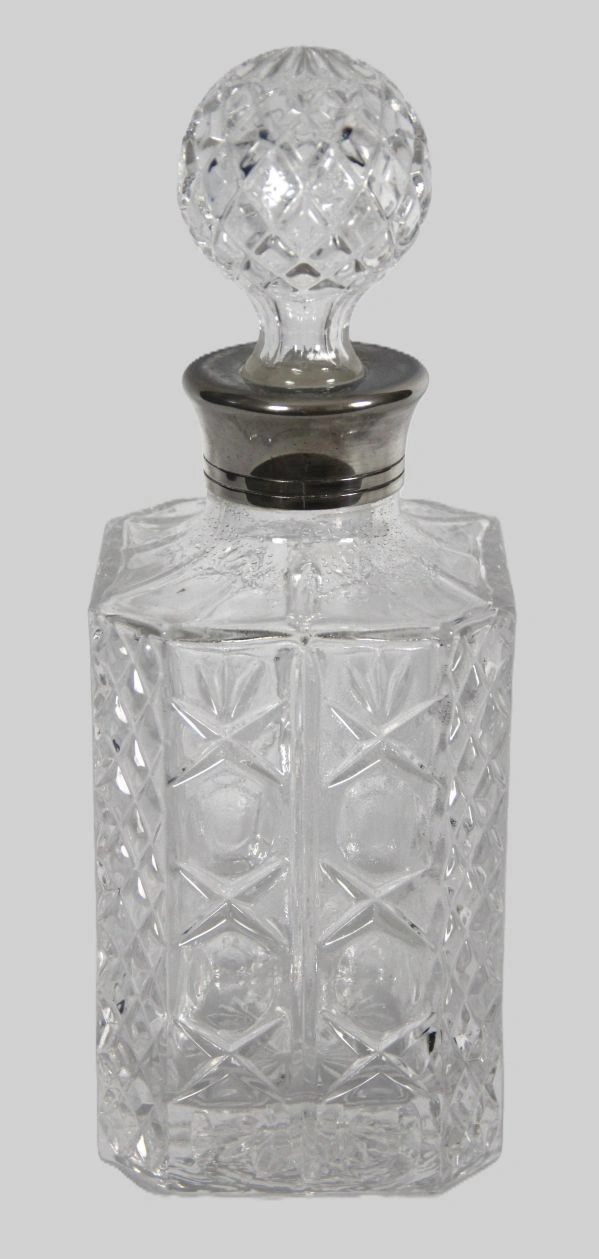 Een diamant geslepen karaf in kristal met een verzilverde nek.