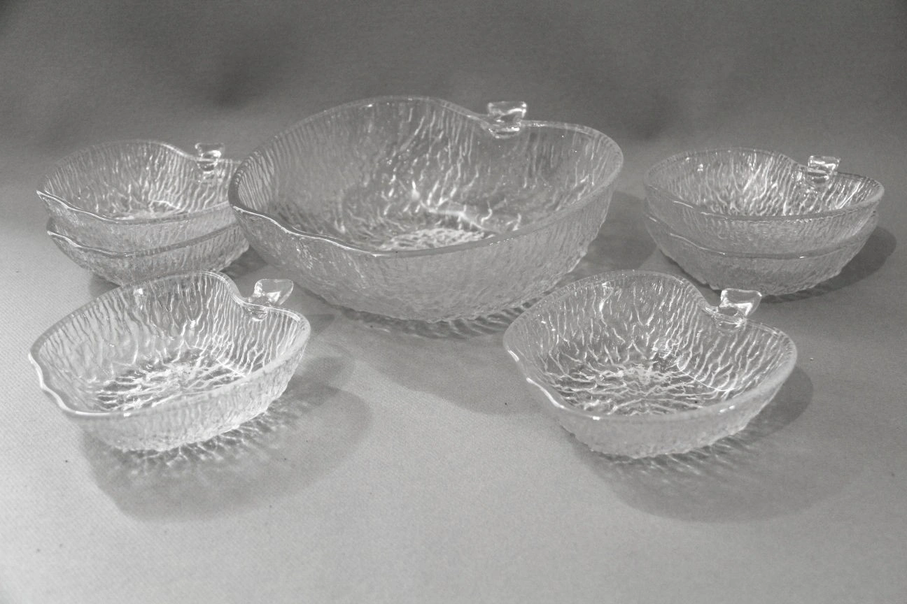 Fruitstel in geperst glas met grote schaal en 6 kleine schaaltjes.