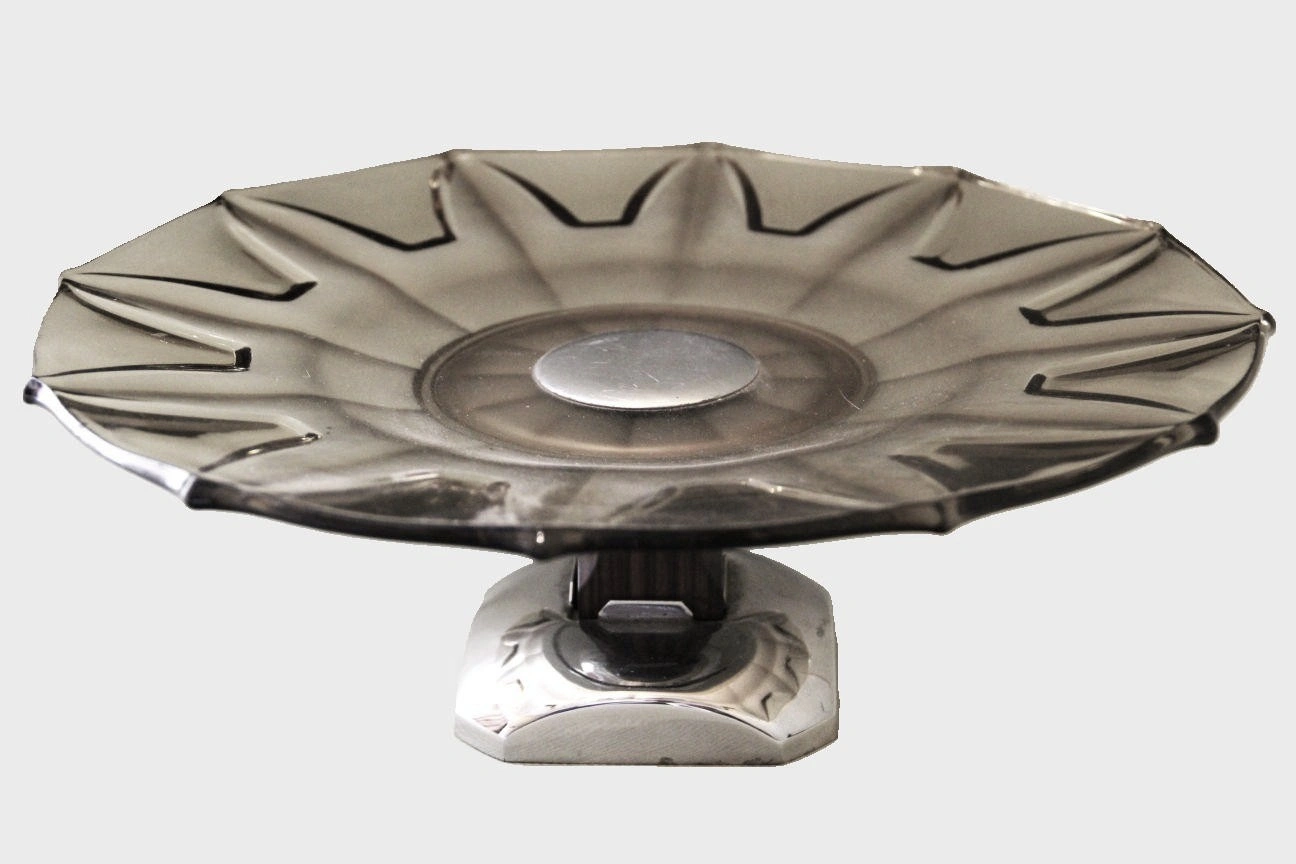 Taartschotel in gerookt glas op voet van palissanderhout en verchroomd metaal.