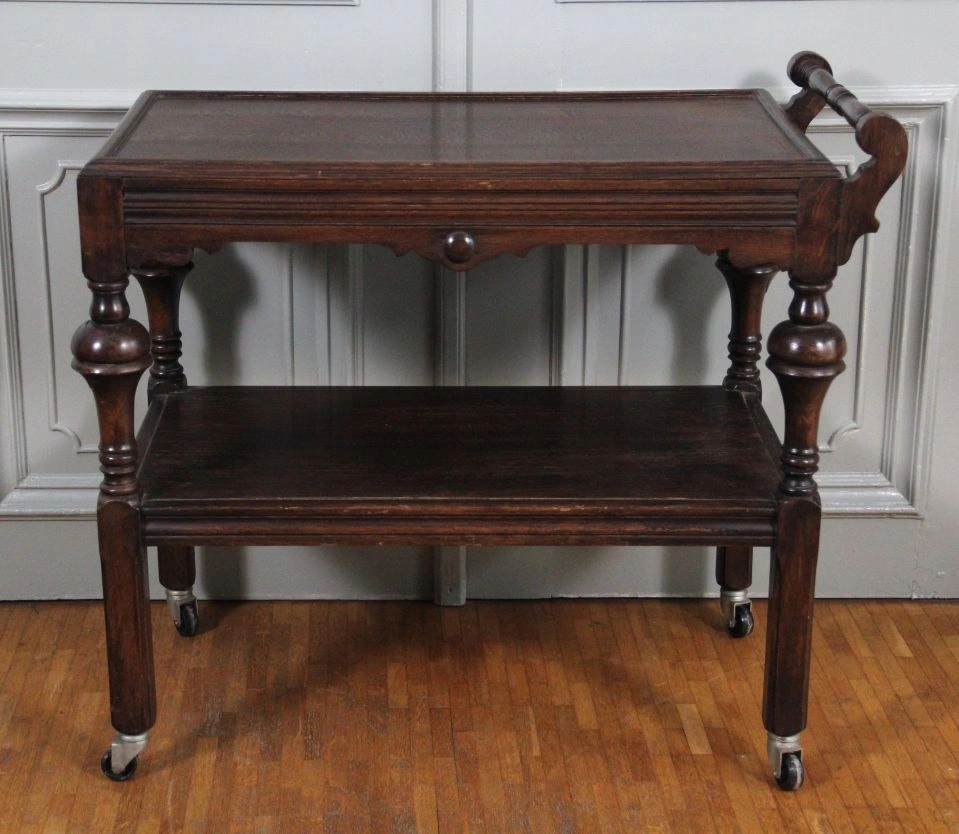 80 x 42cm; 73cm hoog; onderste dienblad op 33cm hoogte en bovenste dienblad op 68cm hoogte.