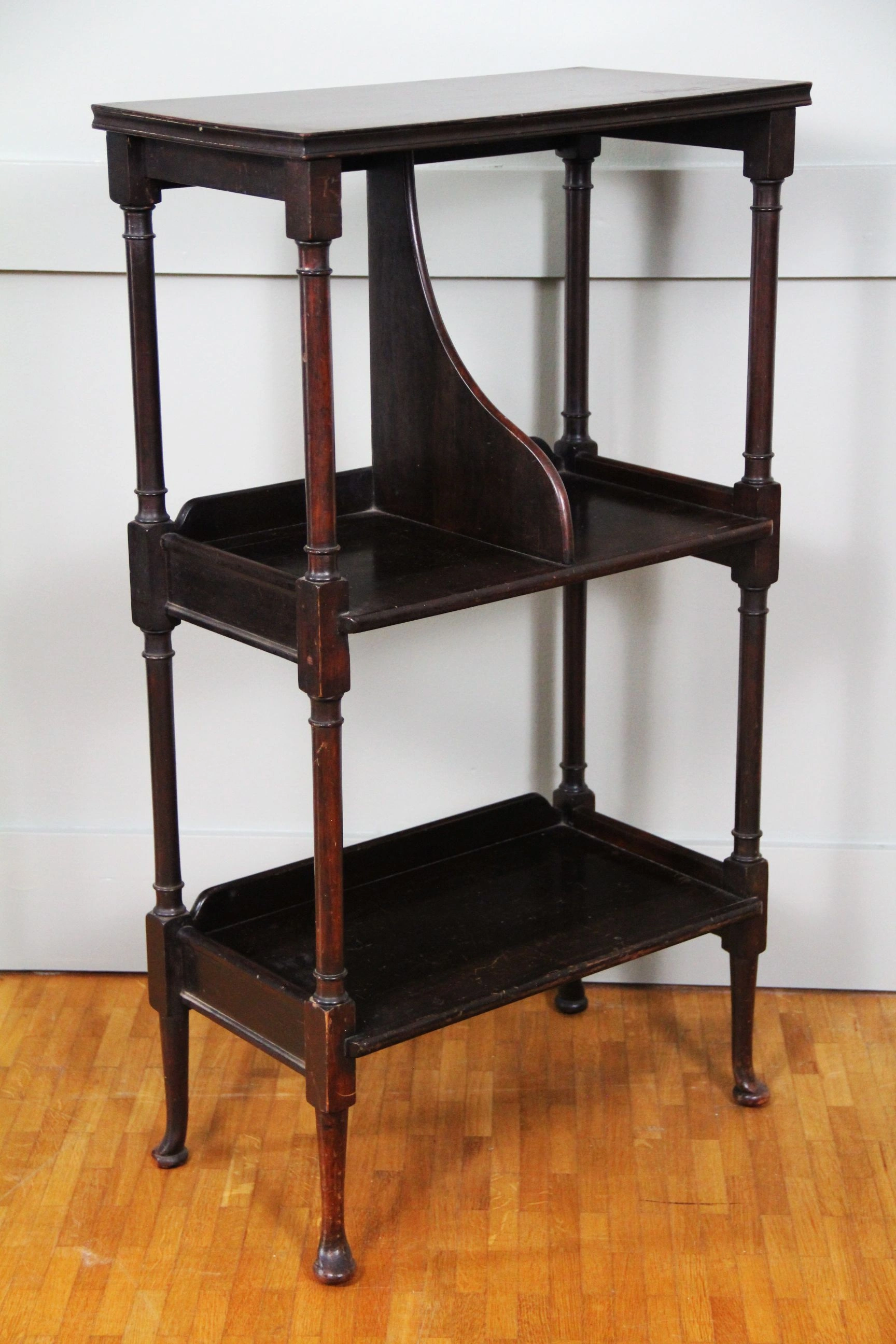 Klein open boekenrek met drie lagen, waarvan de middenste verdeeld, en op padfeet.