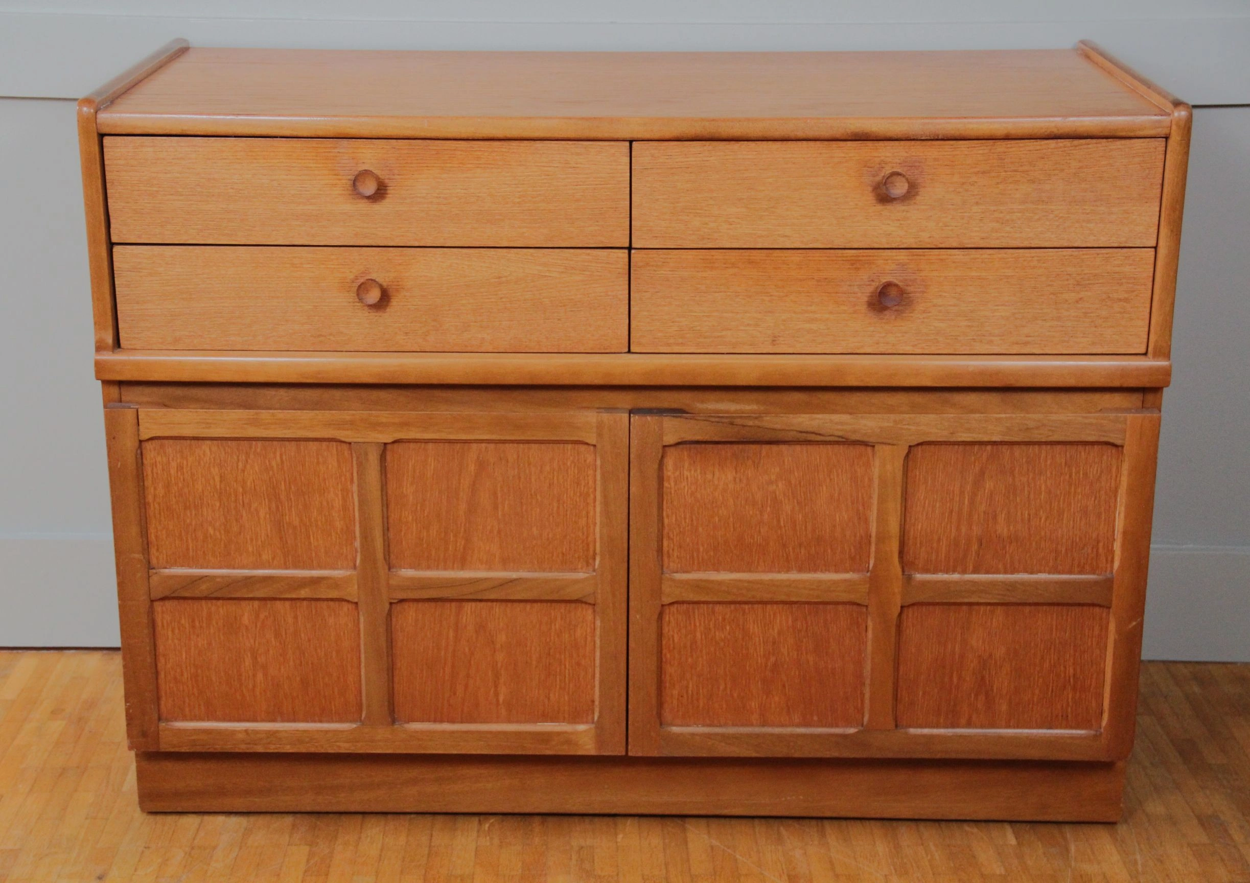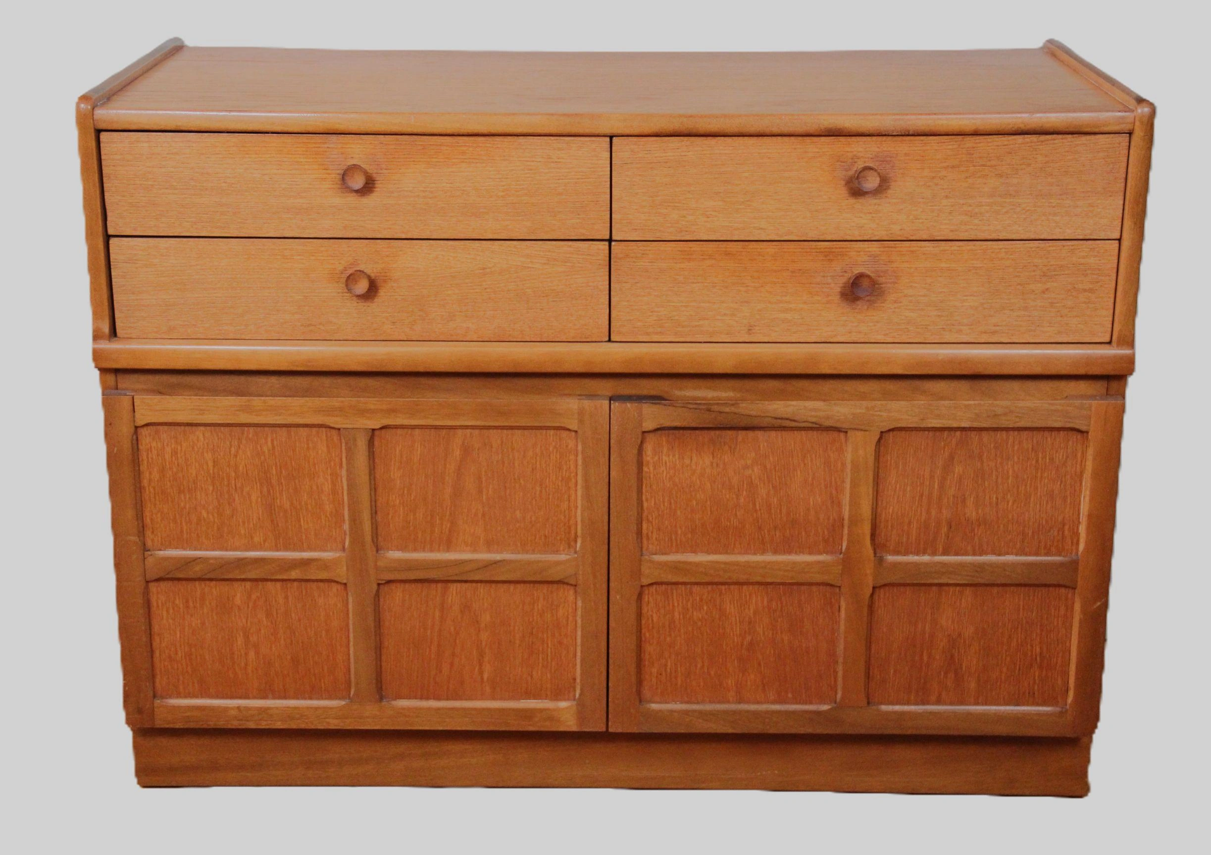 Eiken buffetkast met 4 laden bovenaan en twee deuren onderaan. Engelse meubelmaker; gemerkt "Nathan furniture".