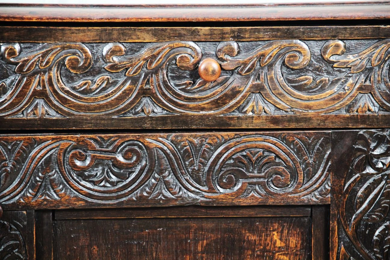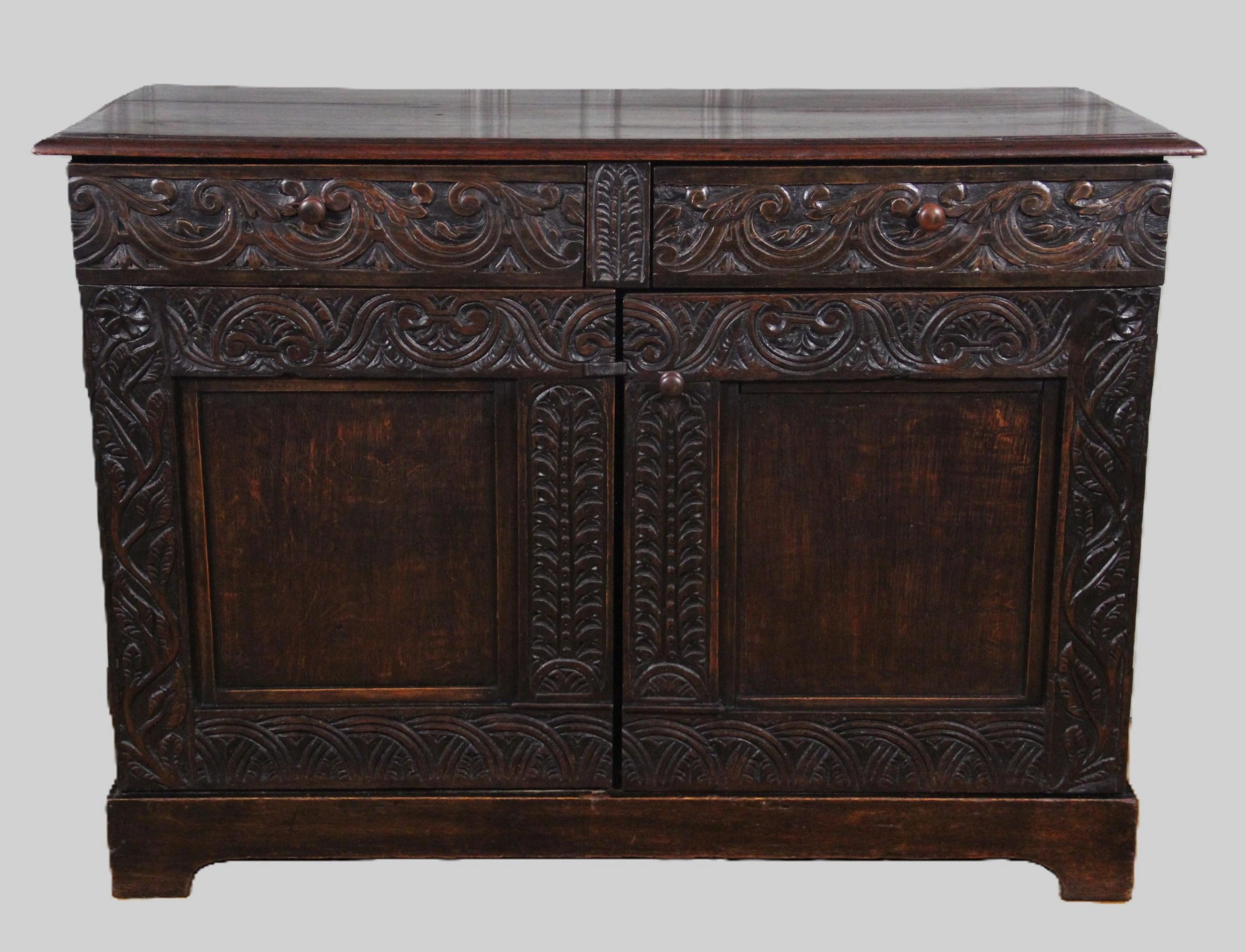 Vroeg 18e eeuws eiken dressoir met twee deuren en bovenaan twee laden. Origineel vlak snijwerk.