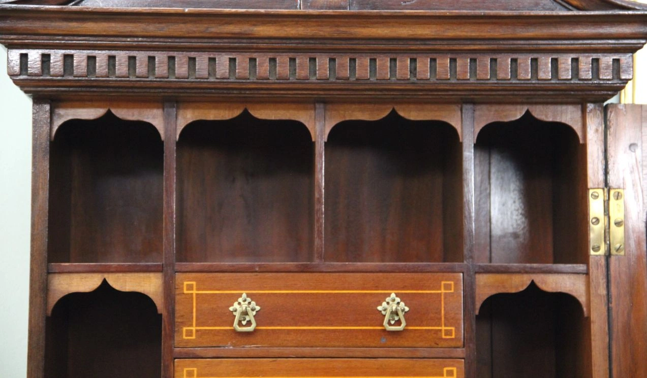 Smal tweedeurs cabinet in mahoniehout met twee deuren boven elkaar. De binnenkant van het bovendeel is ingericht met zeven kleine laden en pigeonholes met gotic revival boogjes. Oorspronkelijke trekkers. Ogee bracket feet. In het geheel een eclectische vormgeving met grotendeels stijlelementen van de Georgean periode.
