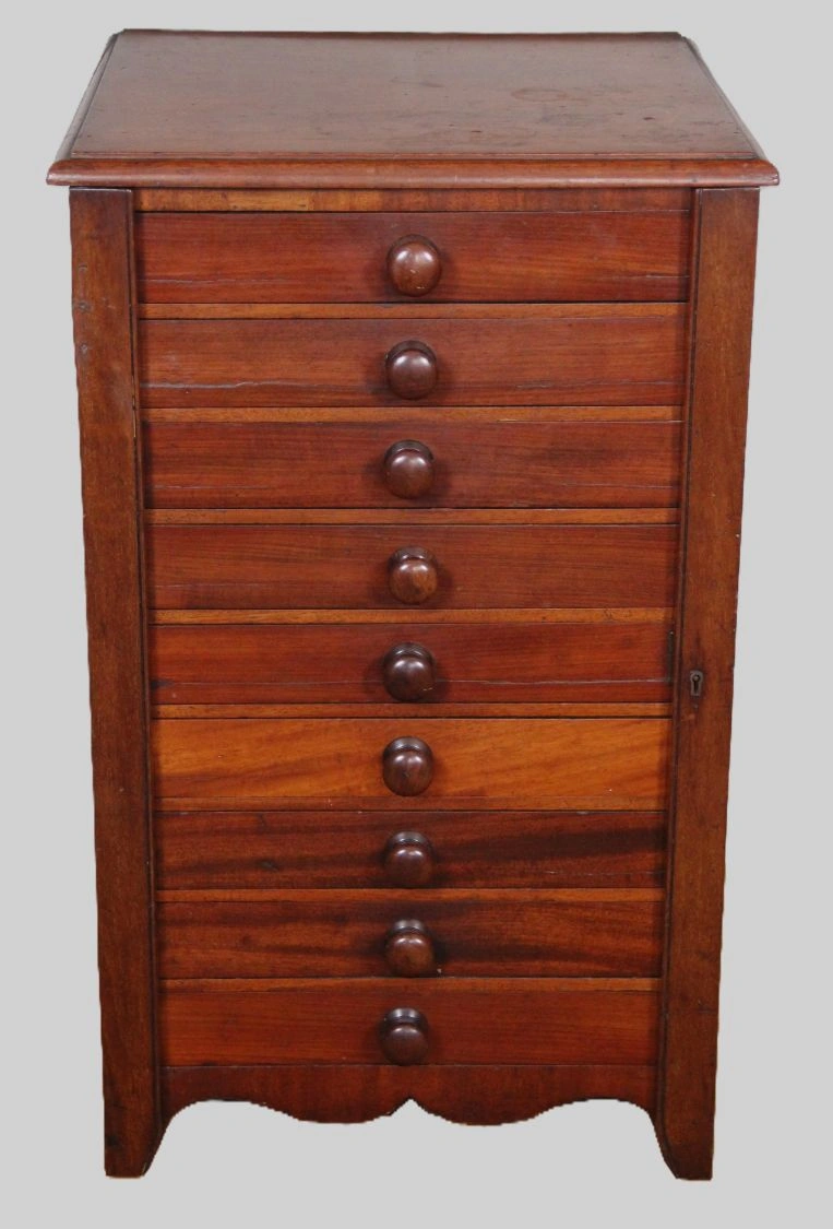 Mahoniehouten veelladenkastje met 9 ondiepe schuifjes, gemeenschappelijk vergrendelbaar.