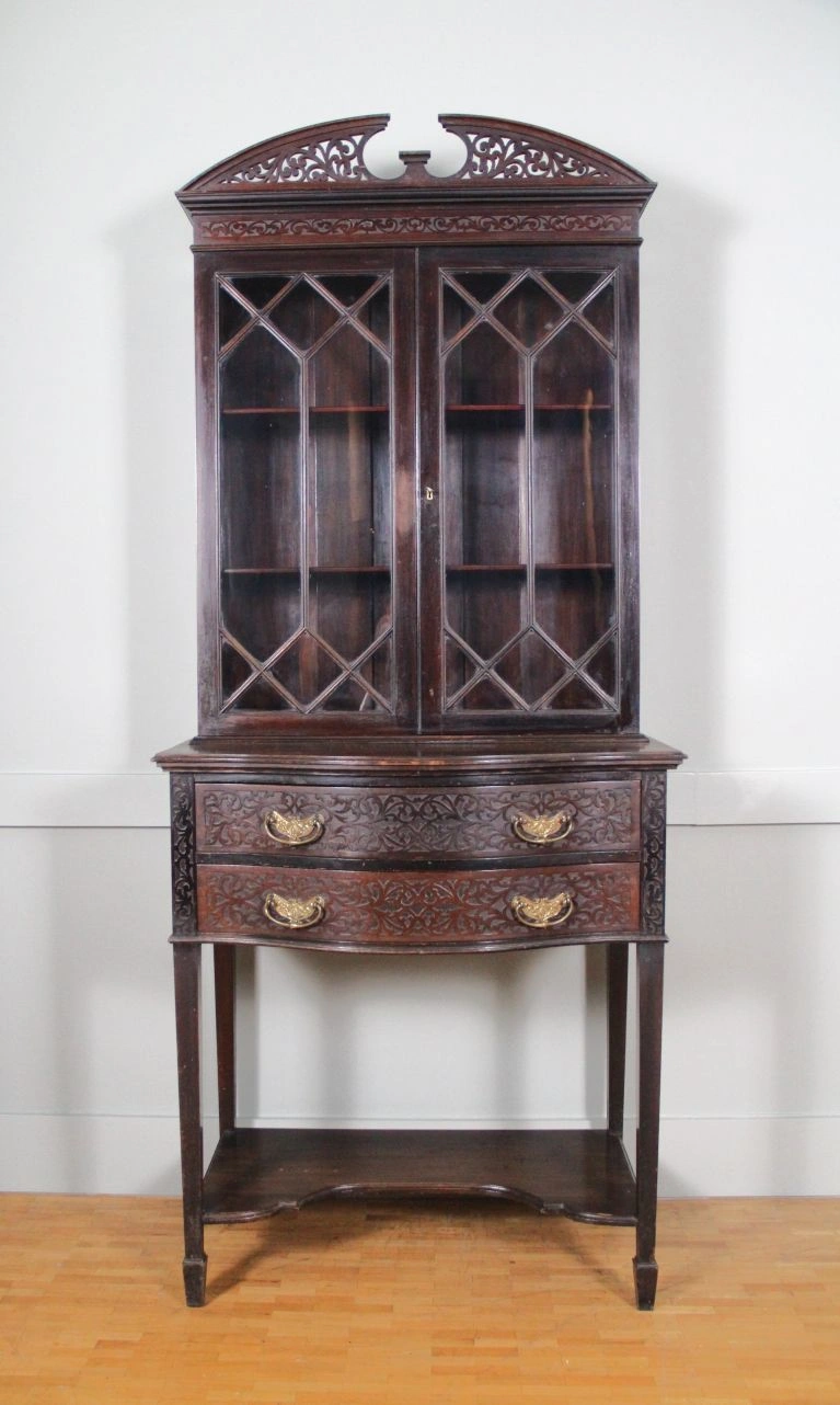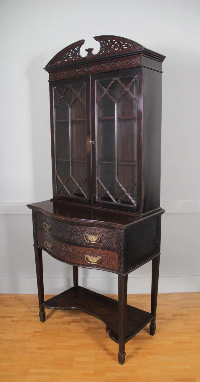 Klein tweeledig cabinet met een lowboy en opzetvitrine. Mahoniehout gedonkerd. Druk vlak snijwerk in laden en op kap (zgn Chippendale stijl). Originele trekkers in gedreven messing.
