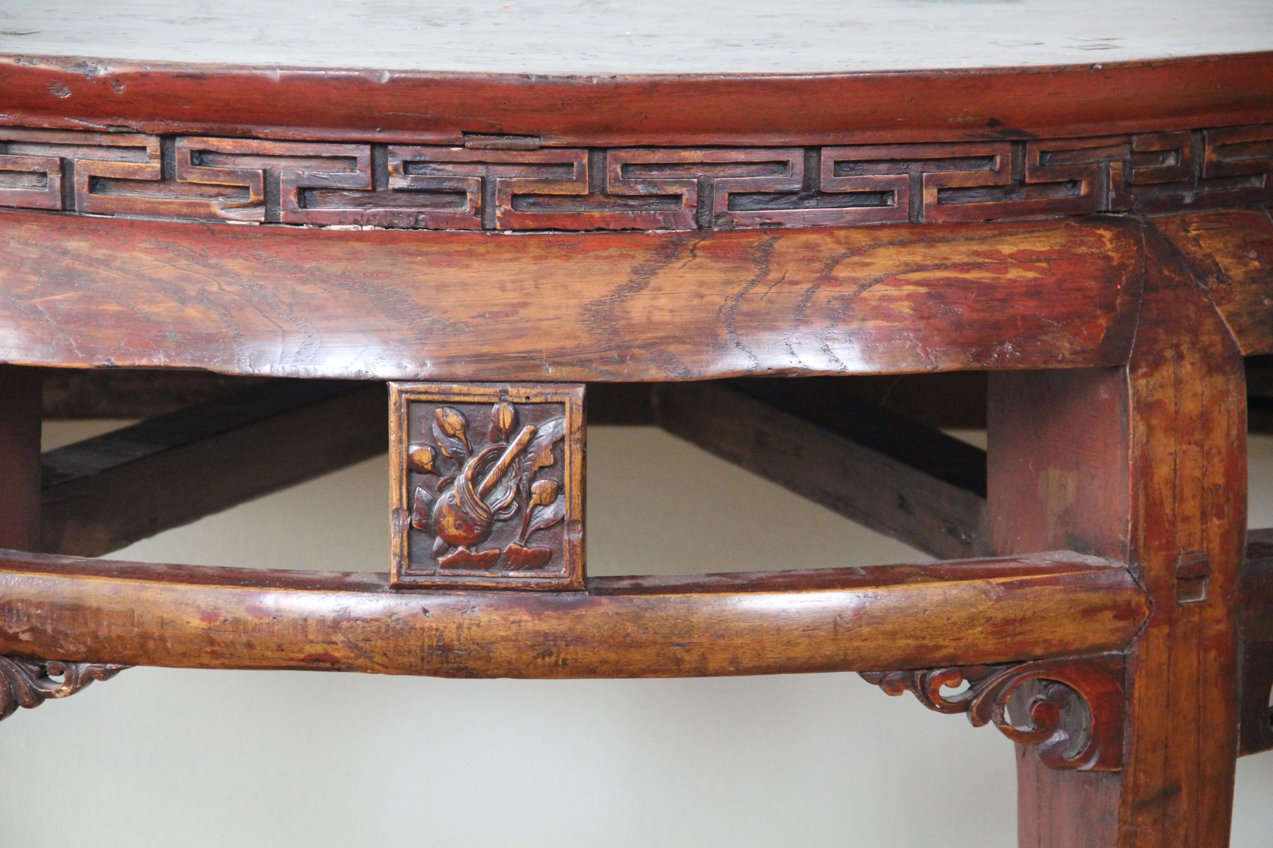 Paar Chinese wandtafels in roodhout. De tafels kunnen samen gezet worden tot één ronde tafel vrijstaande.