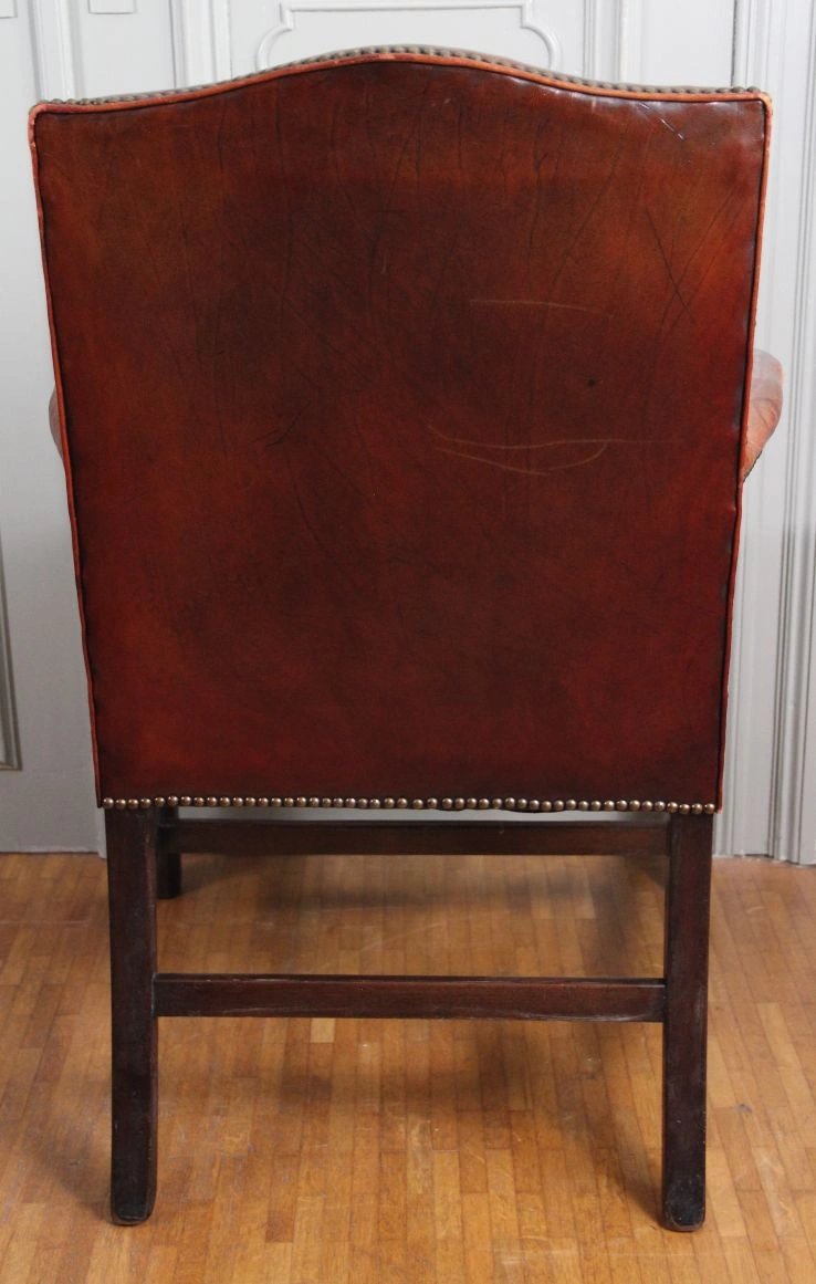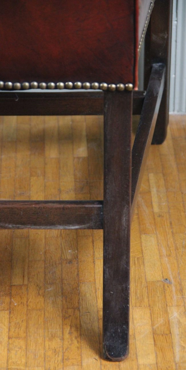 Een mahoniehouten armzetel, met leder bekleed. Licht teruggetrokken armleunen.