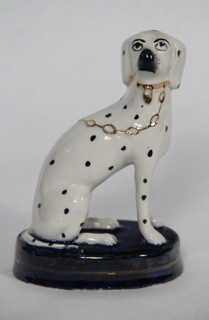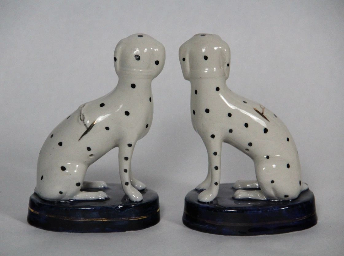 Een koppel typische Staffordshire dalmatiërs op een cobaltblauw voetje.