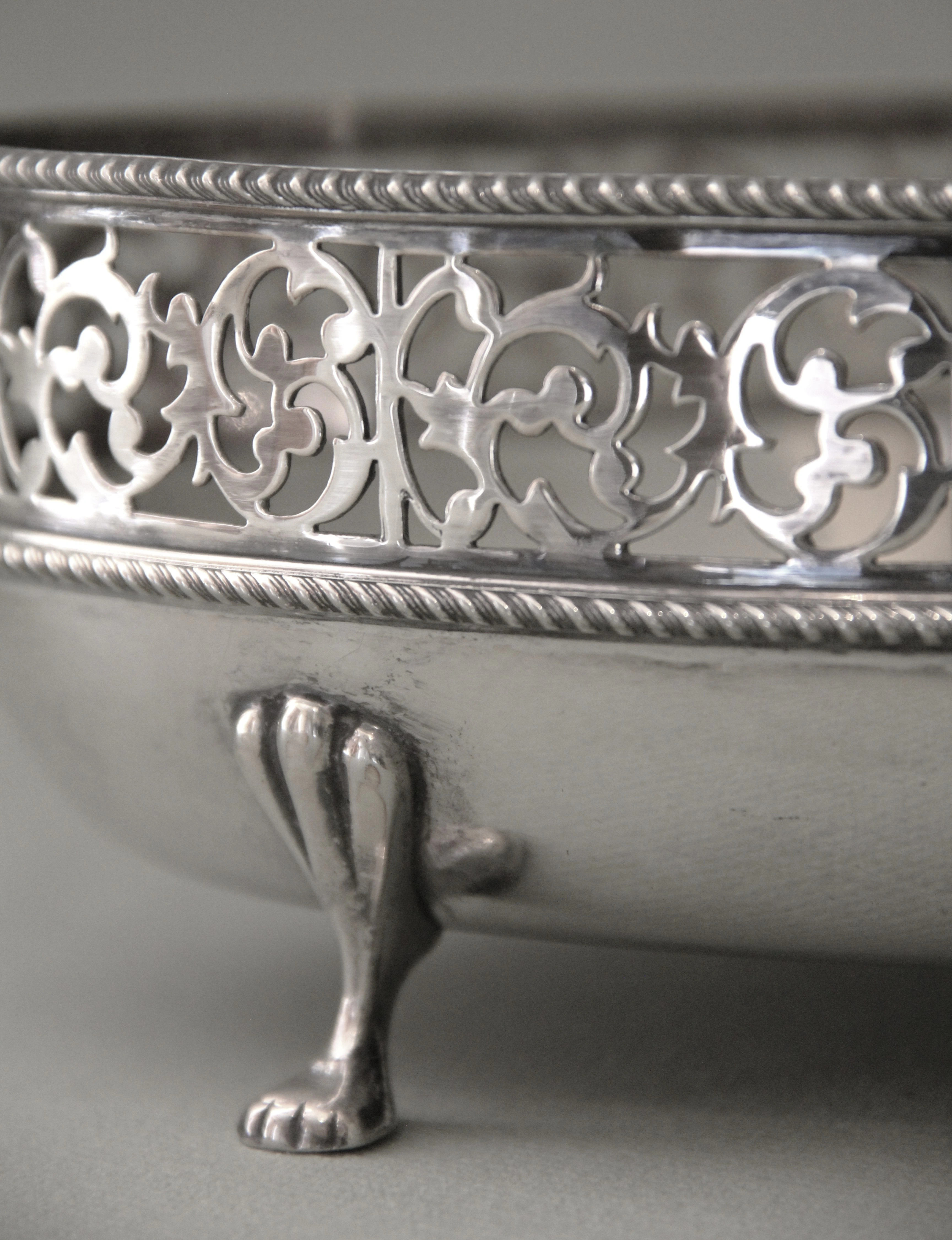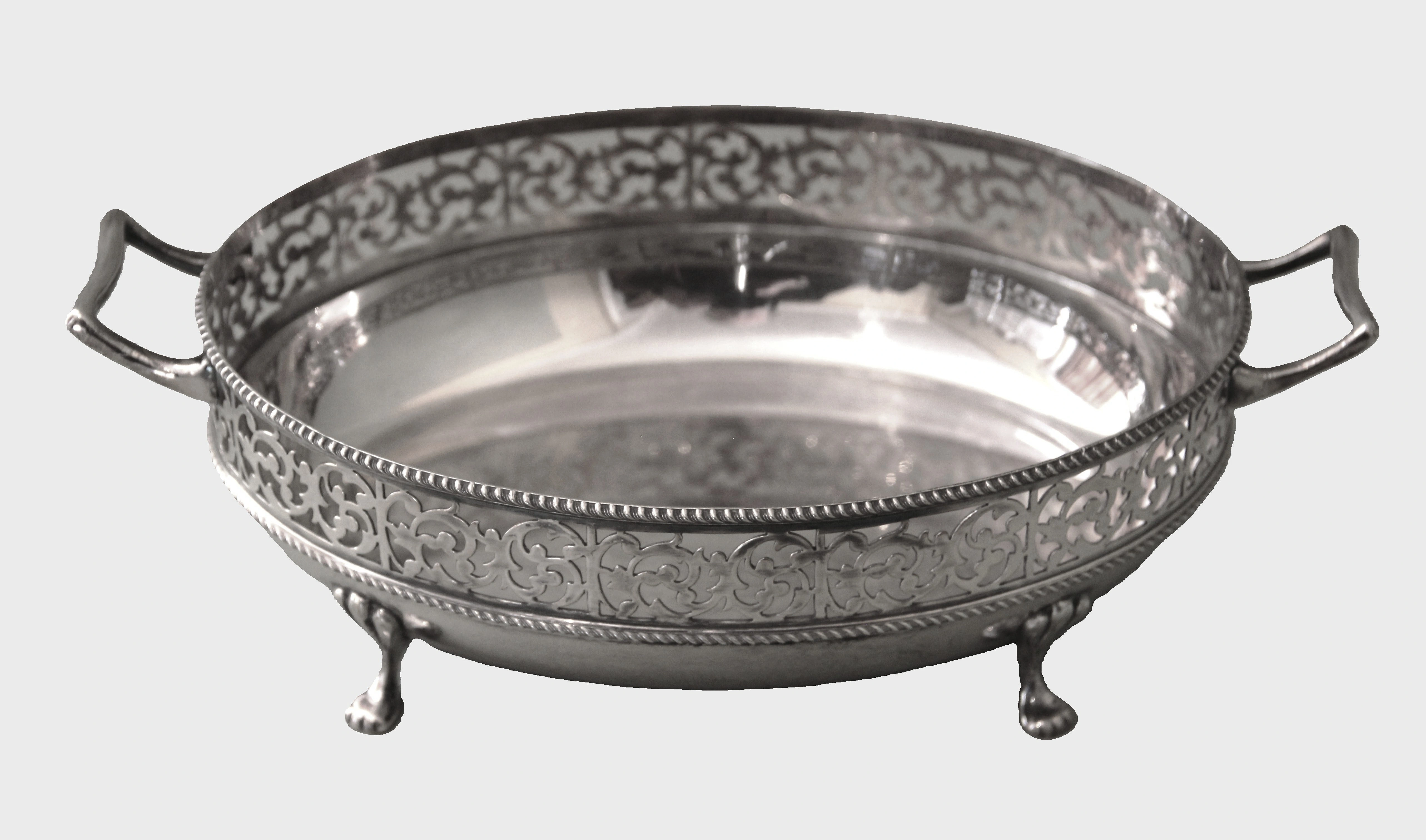 Engelse verzilverde diepe schaal met handgrepen en op pootjes.