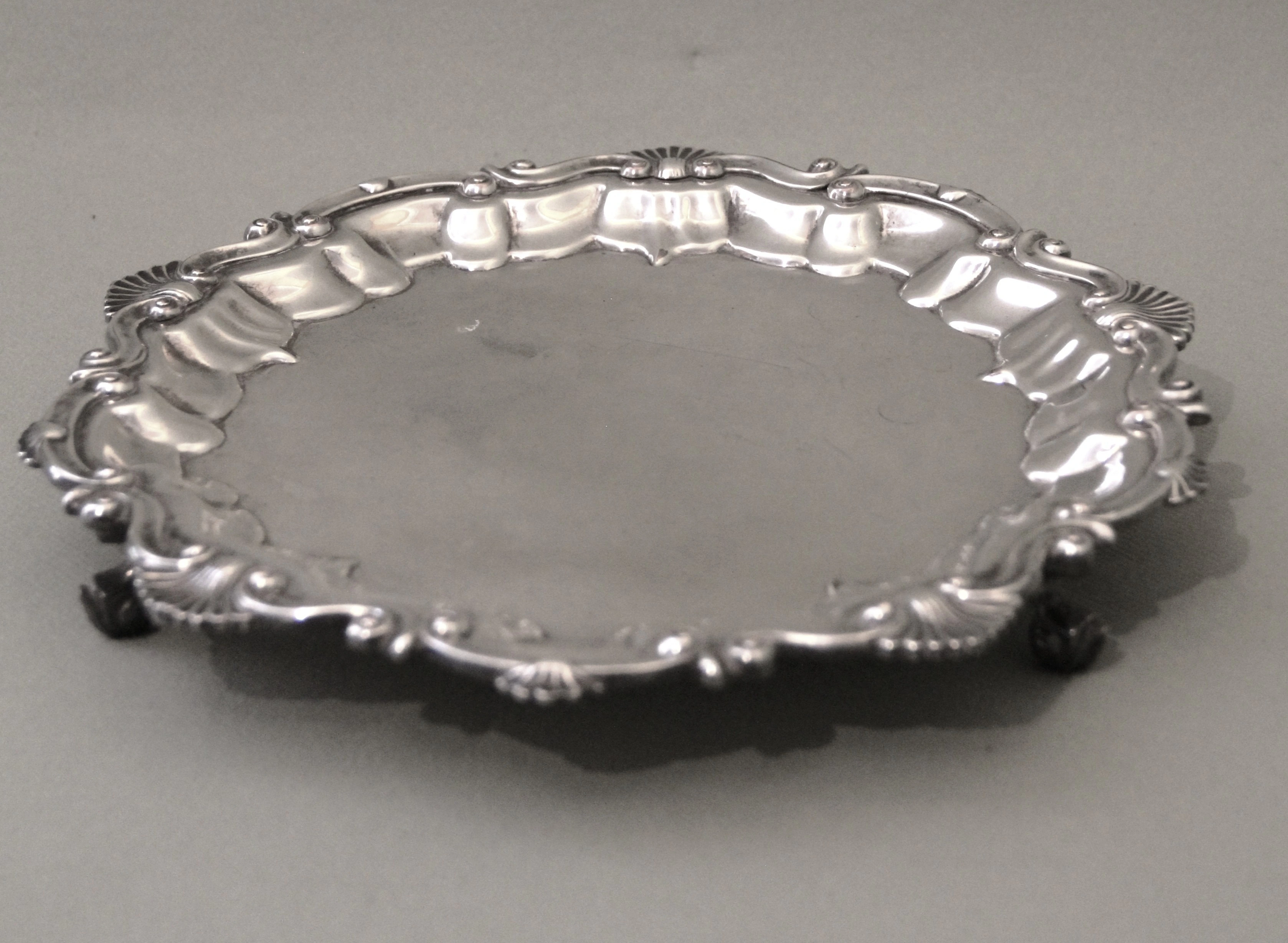 Verzilverd plateautje met gekartelde rand en op pootjes.
