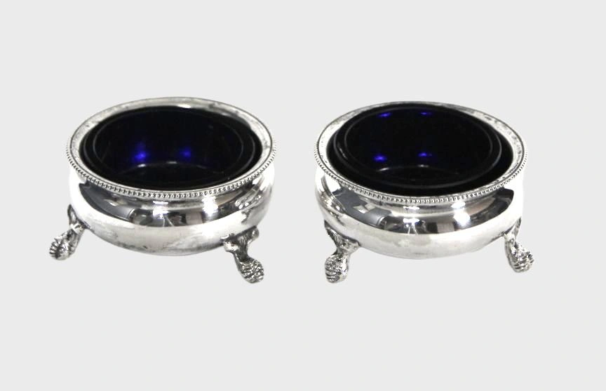 Twee kleine verzilverde zoutschaaltjes met oorspronkelijk blauw glaasje.