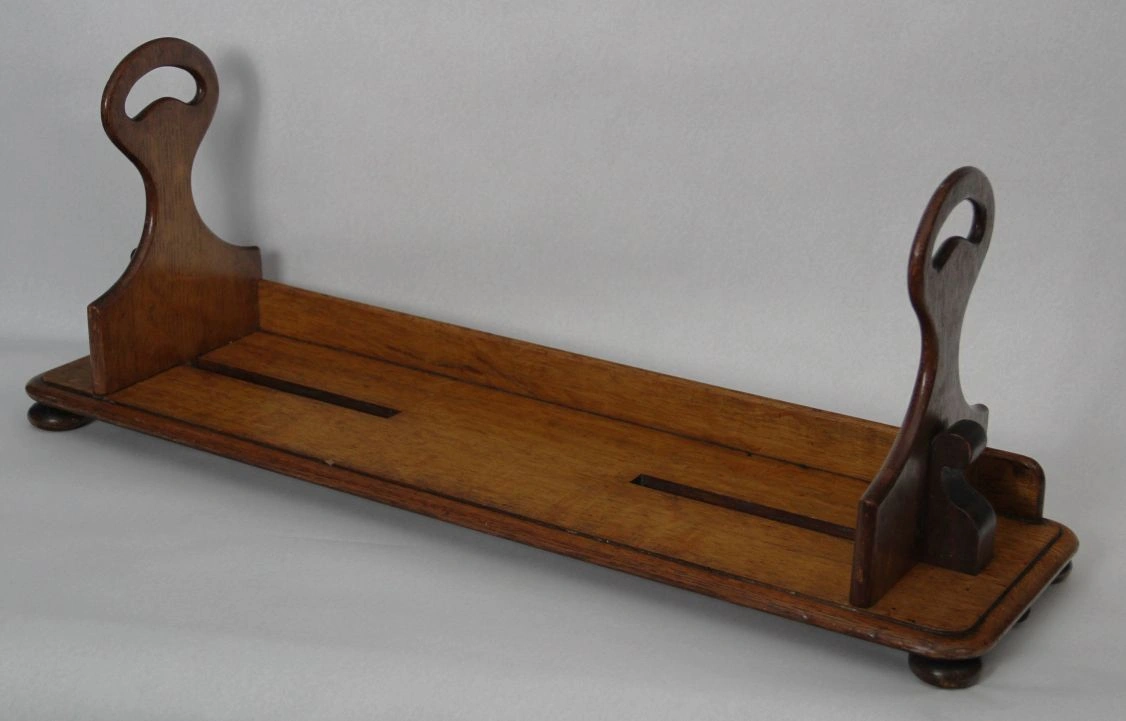 Draagbare boekenstand die oorspronkelijk gebruikt werd in leeszalen van bibliotheken. Met deze boekenstand kon men een serie boeken ophalen en naar de leestafel dragen. De twee steunen zijn verschuifbaar om de boeken samen te houden. De steunrand achteraan belet dat de boeken uit de drager schuiven.