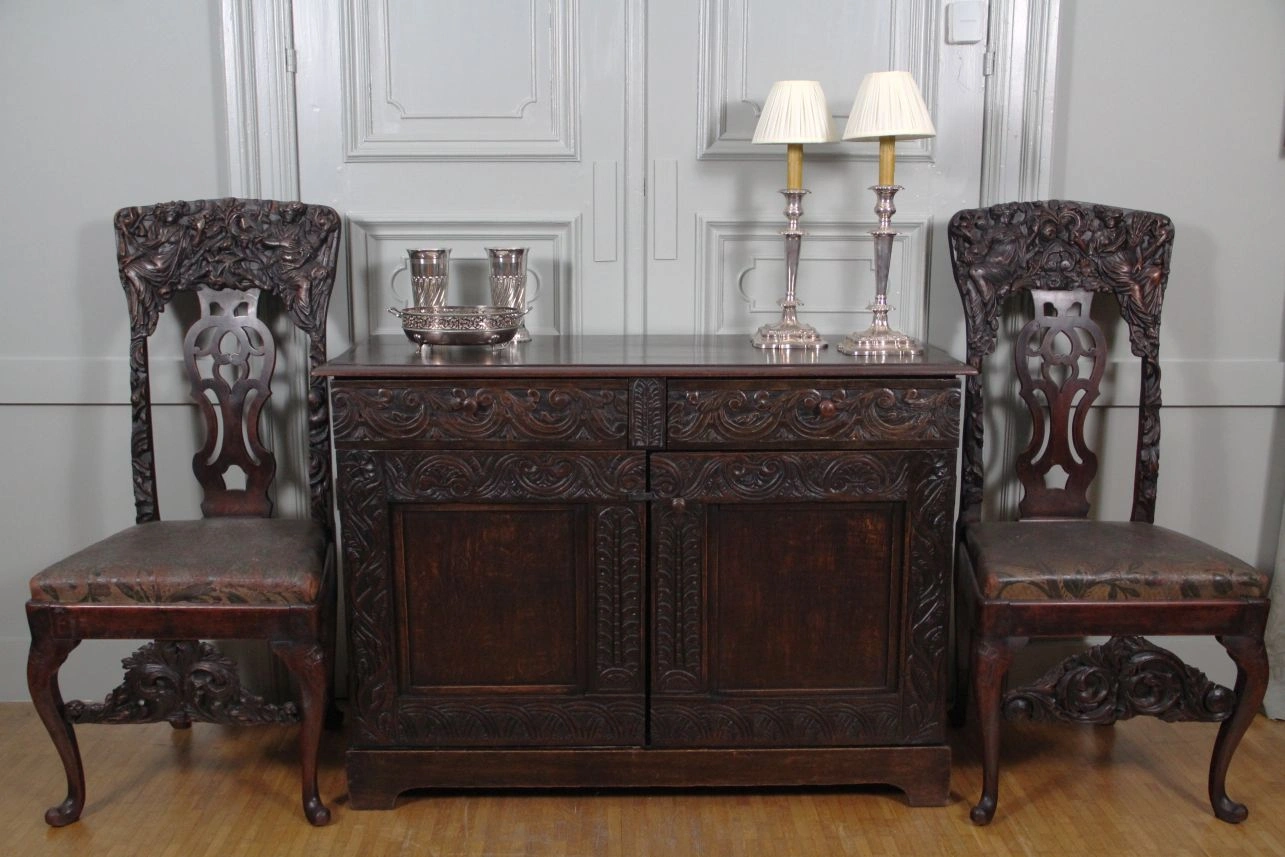 Vroeg 18e eeuws eiken dressoir met twee deuren en bovenaan twee laden. Origineel vlak snijwerk.
