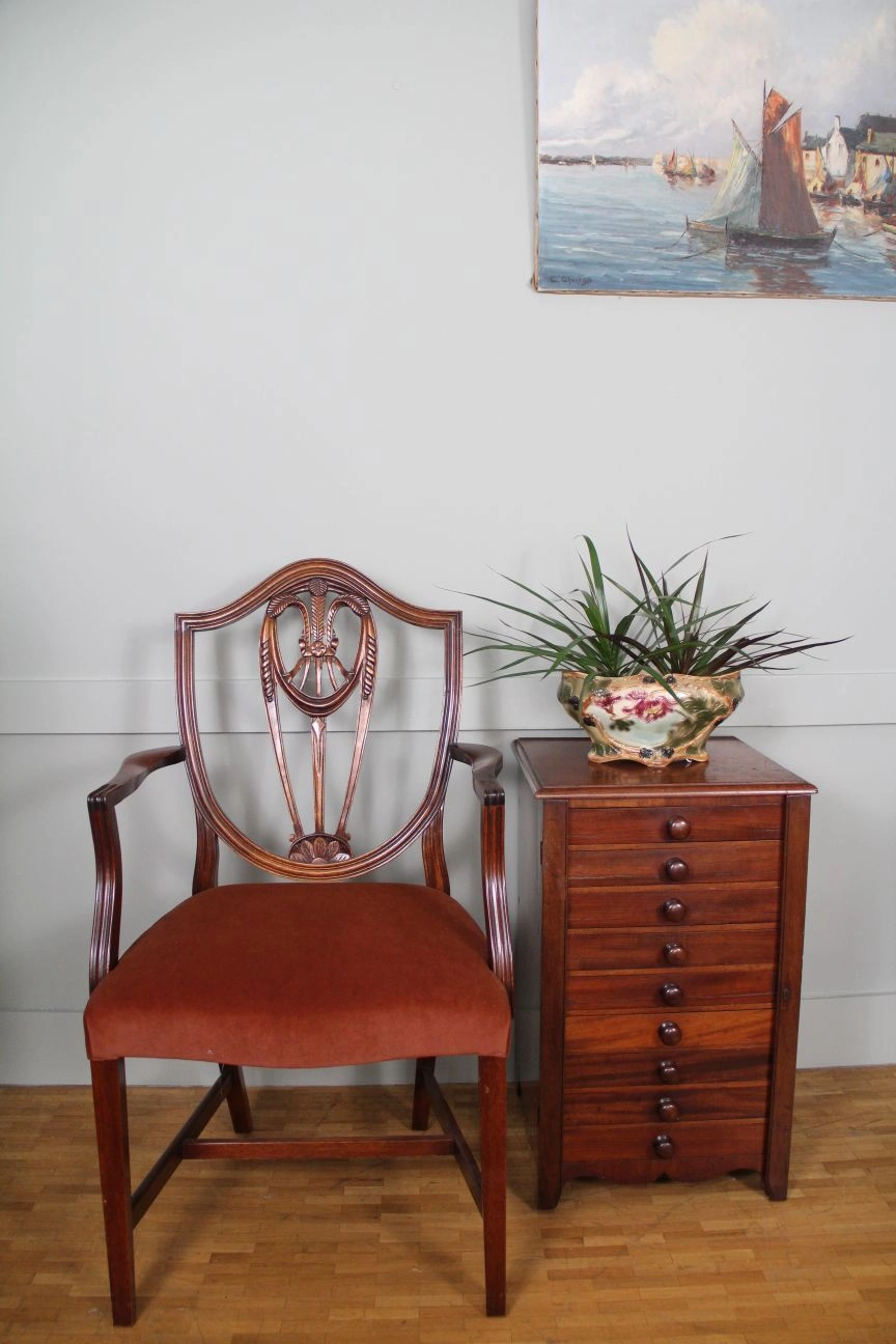 Mahoniehouten veelladenkastje met 9 ondiepe schuifjes, gemeenschappelijk vergrendelbaar.