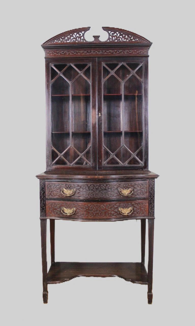 Klein tweeledig cabinet met een lowboy en opzetvitrine. Mahoniehout gedonkerd. Druk vlak snijwerk in laden en op kap (zgn Chippendale stijl). Originele trekkers in gedreven messing.