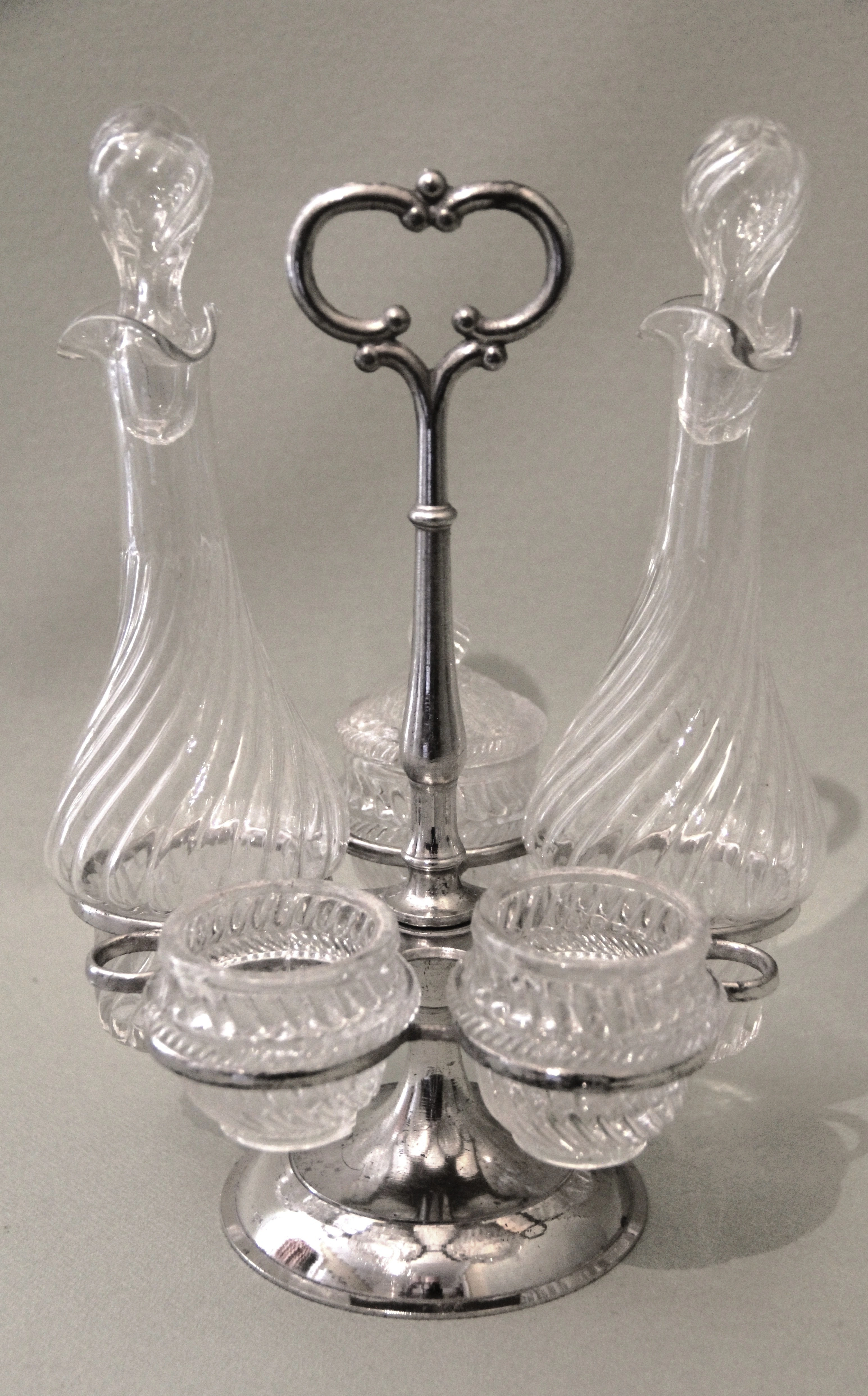 Verzilverd cruetset met twee glazen karafjes, twee zoutvaatjes en mosterdpotje.