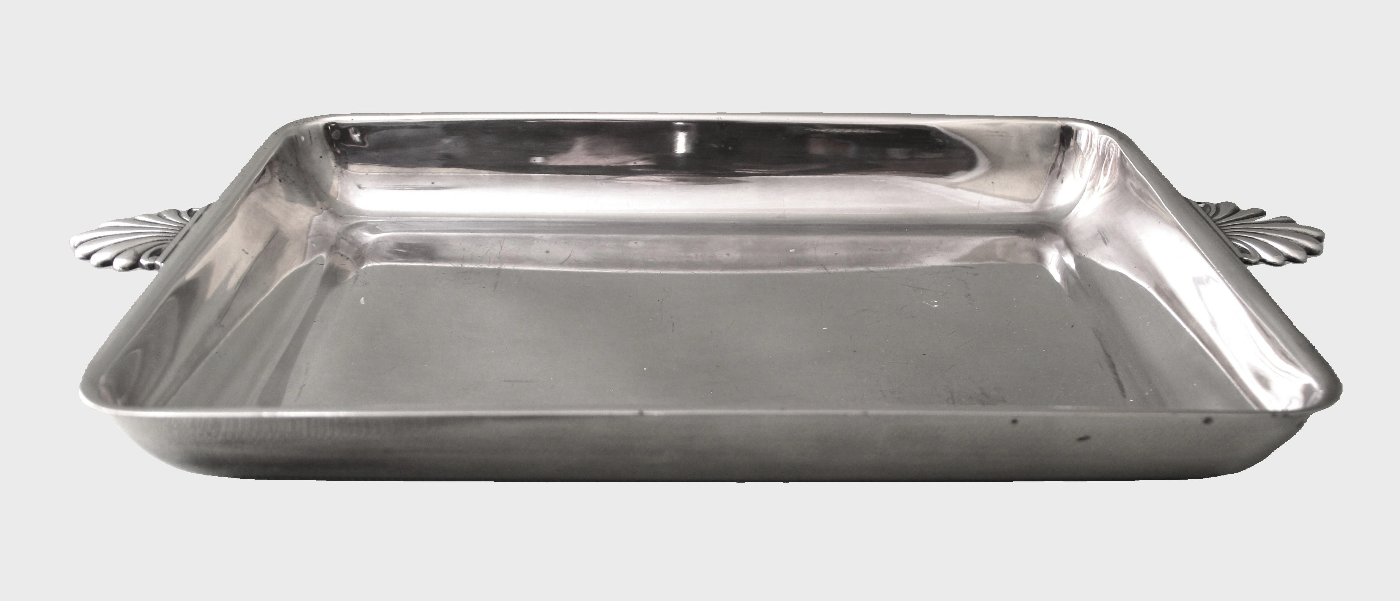 Rechthoekige verzilverde diepe schaal met handgrepen i.v.v. palmetten