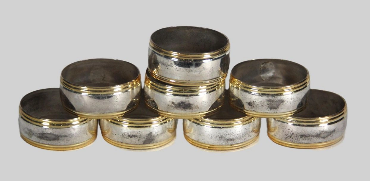 Set van 8 verzilverde servietringen in ovale vorm en goudkleurig aan de randen.