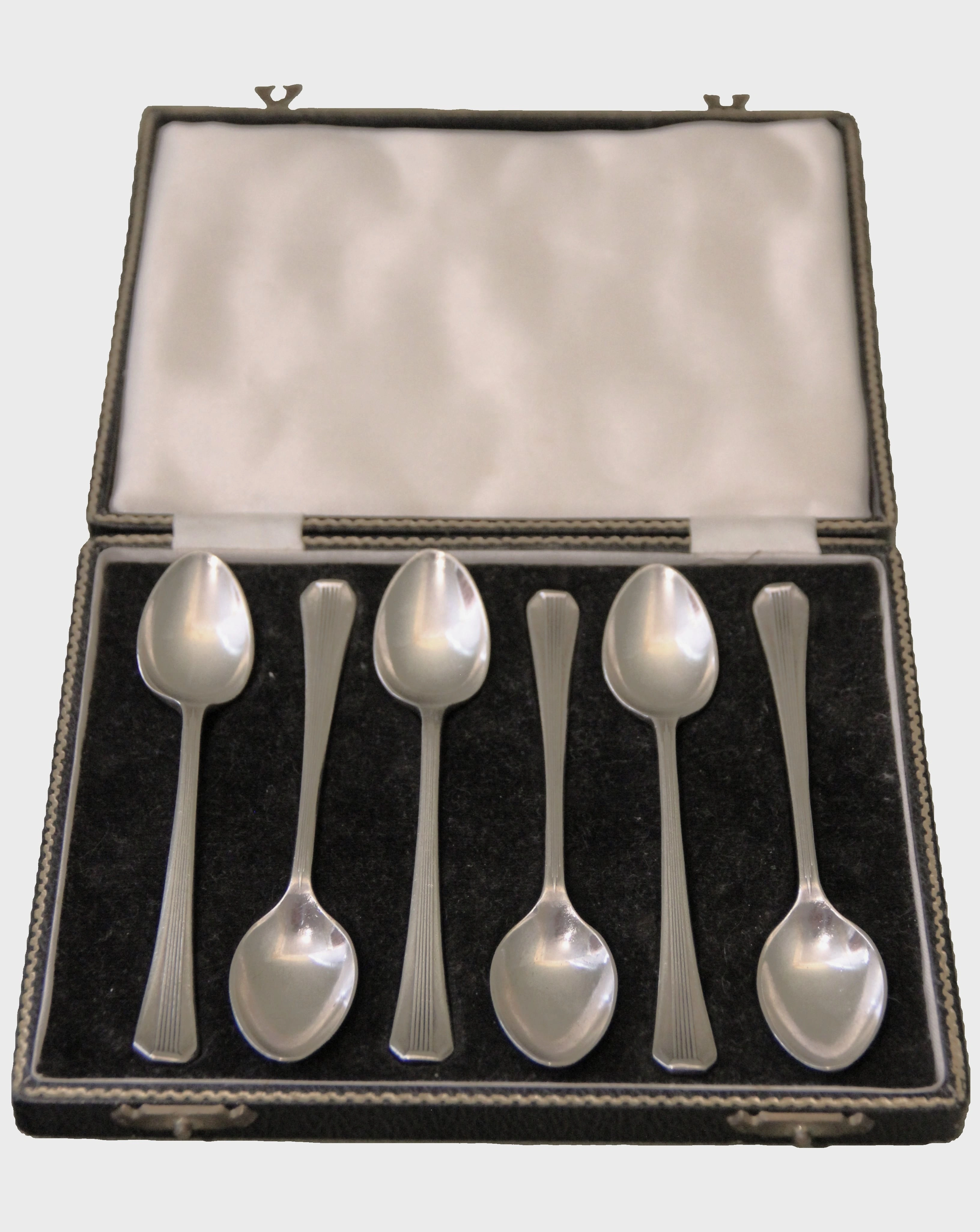 Set van zes verzilverde theelepeltjes in originele doos.